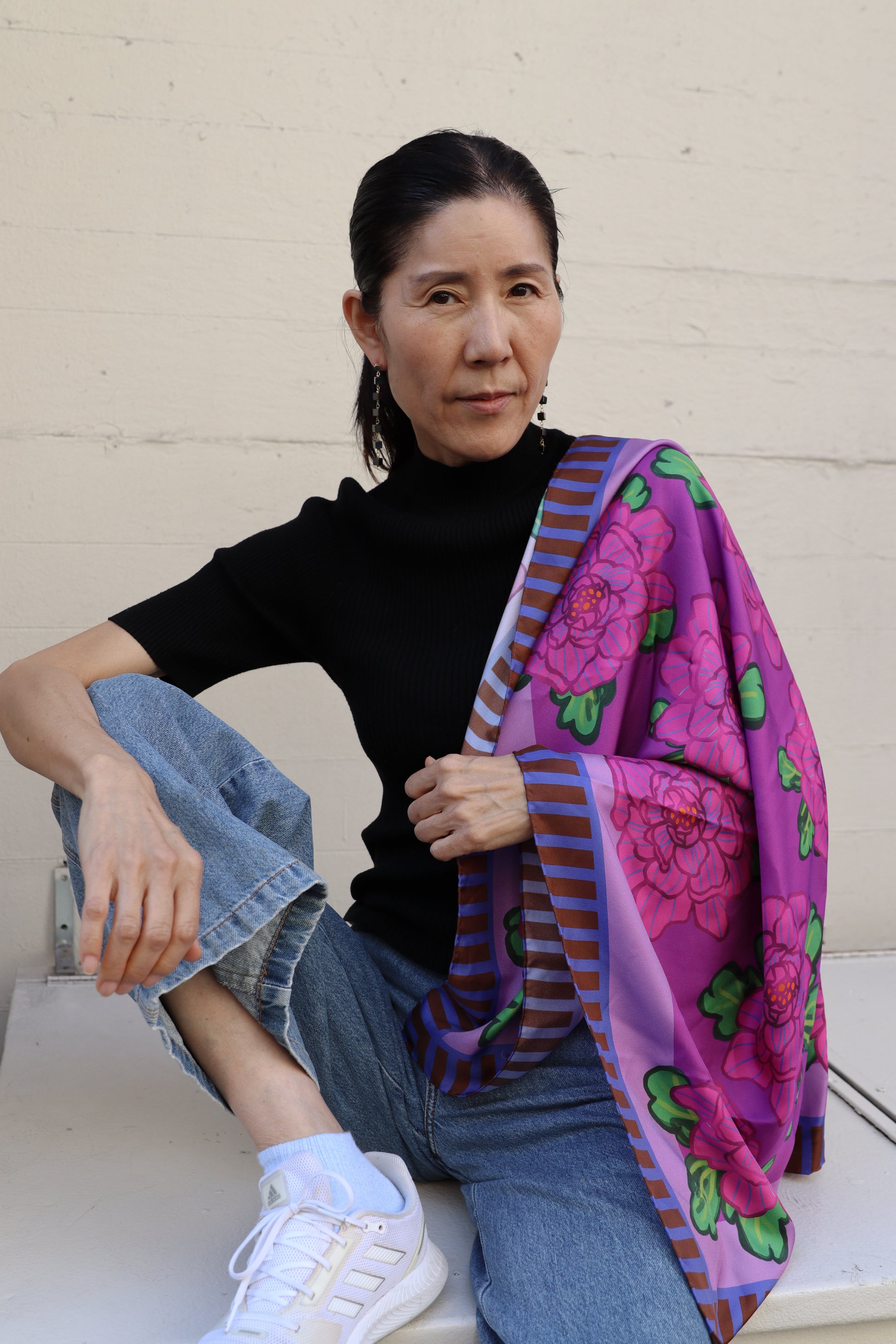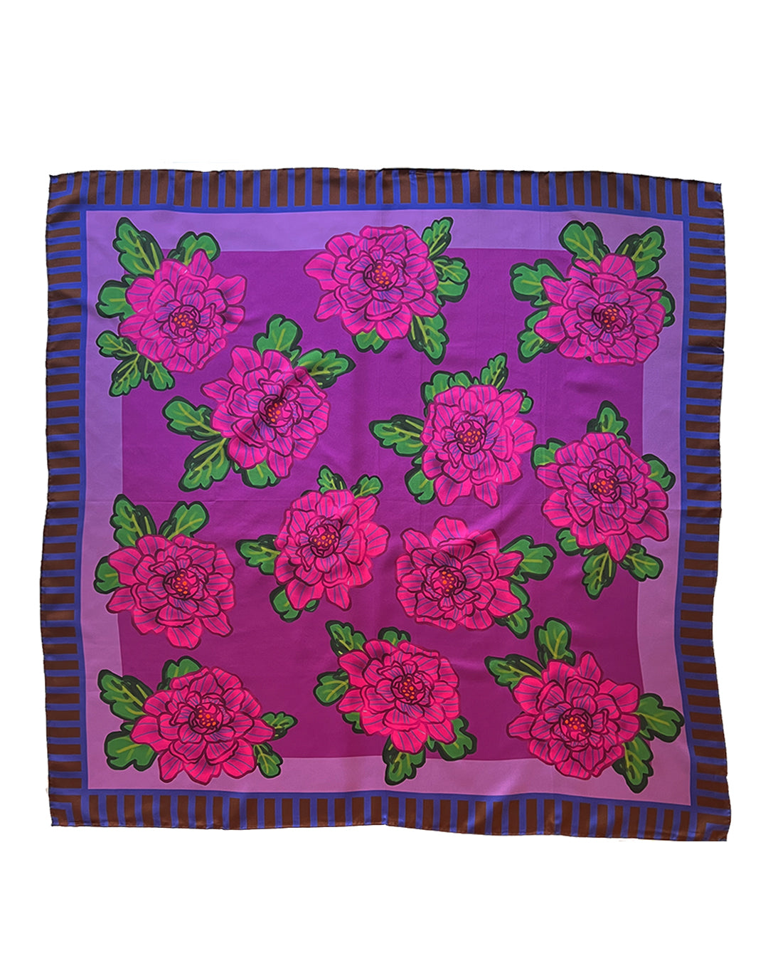 This scarf is a stunning combination of chocolate, fuschia, magenta, pink and Peonies in silk twill. Its unique pattern is sure to add a bright touch to any outfit.